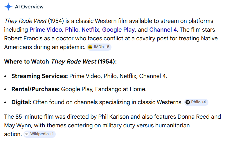 http://www.tcm.com/tcmdb/title/4271/They-Rode-West/ provides Overview: Full Credits, Full Synopsis, Notes, http://www.tcm.com/tcmdb/title/4271/They-Rode-West/notes.html Screenplay Info, Original Print Info, Genre, Key Words, User Reviews, Other Reviews, Articles (Money, Awards), http://www.tcm.com/tcmdb/title/4271/They-Rode-West/articles.html Quotes, Trivia, Home Video Reviews, Miscellaneous Notes, Alternate Versions, Theatrical Aspect Ratio, Video, Fan Sites