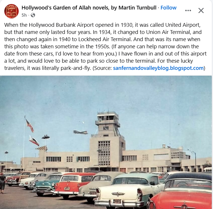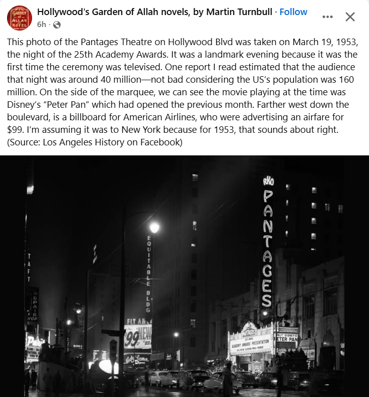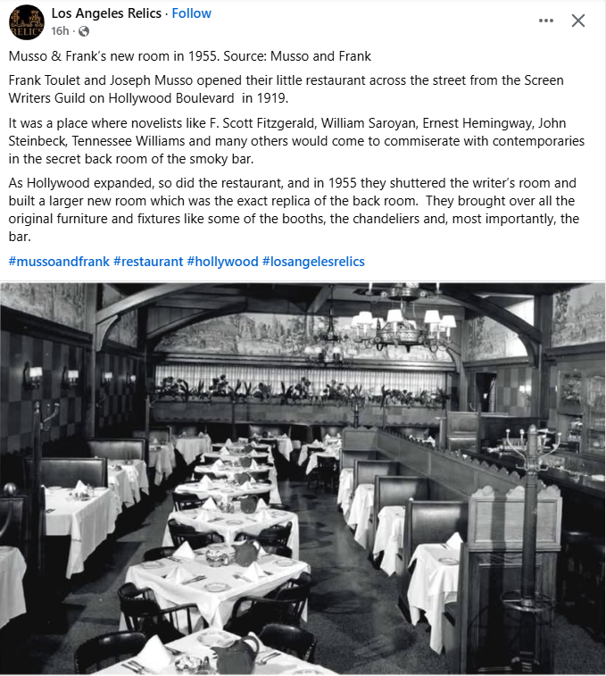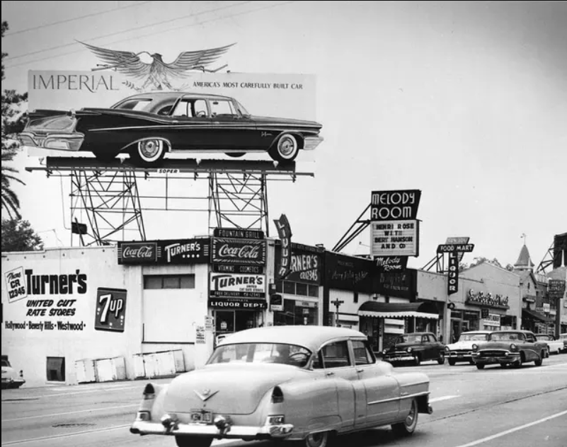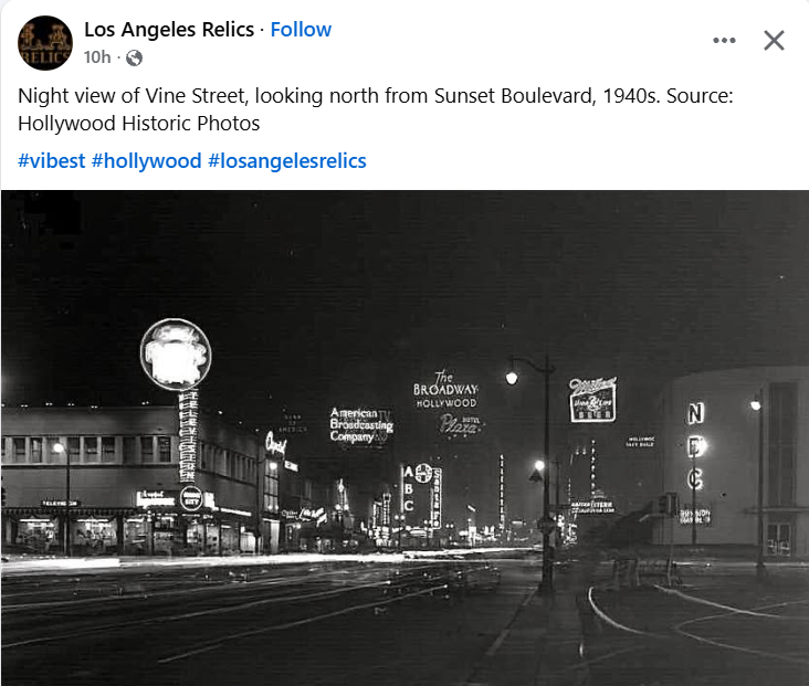 This map (date unclear but probably post-WWII before several major freeways added) indicates locations of four of the five-plus Brown Derby restaurants. (Wikipedia’s “Brown Derby” entry provides details of when and where the chain was built.) Starting in the upper right quadrant and moving west: Glendale (where Bob was born) is directly west of Pasadena. Note that many places are mentioned often throughout this website in the context of Bob’s life, e.g., Lockheed Air Terminal and Burbank (where he died), Griffith Park and its Planetarium (featured in many movies including “Rebel Without a Cause”), San Fernando Valley and Hollywood Bowl. The references to radio studios suggest this is a map from the days before television dominated the entertainment world. The first Brown Derby, built in the distinctive shape of a derby hat, at 3427 Wilshire Blvd. was across the street from the Cocoanut Grove at the Ambassador Hotel. It opened in 1926 and was demolished in 1936 in part because it had terrible acoustics. Despite its less distinctive Spanish Mission style facade, the second Brown Derby (aka the Hollywood Brown Derby), which opened in 1929 at 1628 N. Vine St., was the branch that played the greater part in Hollywood history (and was the originator of the Cobb Salad and the Shirley Temple non-alcoholic drink). Due to its proximity to movie studios, it became the place to do deals and be seen. It closed in 1985 and was demolished in 1994. The third Brown Derby opened in 1931 at 9537 Wilshire Blvd. in Beverly Hills, across from the Beverly Wilshire Hotel. Decorated in an Old English style early in its history, it closed in 1986 and was demolished. The fourth Brown Derby at 3377 Wilshire Blvd. and Alexandria Ave. opened in 1936. It closed in 1980 and was demolished but the derby hat structure was incorporated into subsequent buildings on the site. Another Brown Derby at 4500 Los Feliz Blvd. opened in 1940. It was designated an official Historic Cultural Monument of the City of Los Angeles in 2006. Now the Los Feliz Brown Derby space is occupied by a gastropub and a Chase bank; its dome is divided in half between the two businesses. The interior framing details of the dome construction have been exposed and are now visible from inside the restaurant. There were and are a number of other Brown Derby restaurants in the Los Angeles area and beyond, including a fifth one that opened the year, 1955, Bob died. The Brown Derby Crenshaw Center in the Baldwin Hills neighborhood was a 24-hour coffee at 3625 Stocker Ave. Whether Bob ever had a drink or meal at any of the Brown Derbys is unknown, but he had proximity to the Brown Derby at 3377 Wilshire Blvd. and Alexandria Ave. once he was at Columbia, and to the Hollywood and Beverly Hills restaurants. The middle of the map shows several still-there landmarks: Pantages Theater and Grauman’s Chinese Theatre on Hollywood Blvd., a “Big Five” studio, Paramount, and two smaller studios (Columbia, Bob’s home studio, and RKO), all between Sunset Blvd. and Wilshire Blvd. (Wikipedia)