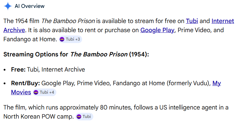 http://www.tcm.com/tcmdb/title/27592/The-Bamboo-Prison/ provides Overview: Full Credits, Full Synopsis, Notes, http://www.tcm.com/tcmdb/title/27592/The-Bamboo-Prison/notes.html Music, Screenplay Info, Original Print Info, Genre, Key Words, User Reviews, Other Reviews, Articles (Money, Awards), http://www.tcm.com/tcmdb/title/27592/The-Bamboo-Prison/articles.html Quotes, Trivia, Home Video Reviews, Miscellaneous Notes, Alternate Versions, Theatrical Aspect Ratio, Video, http://www.tcm.com/tcmdb/title/27592/The-Bamboo-Prison/videos.html Fan Sites
